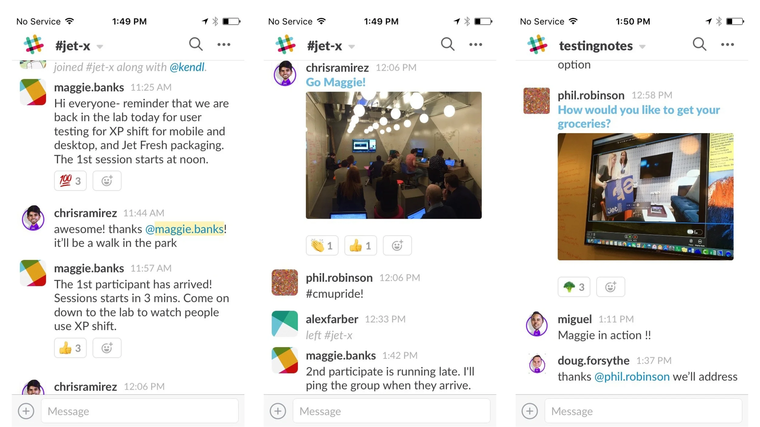 Our slack channel, "testingnotes" was a place for developers and designers to take real time notes on the shop-alongs. It was also a way for me to communicate with other researchers in the observing room.